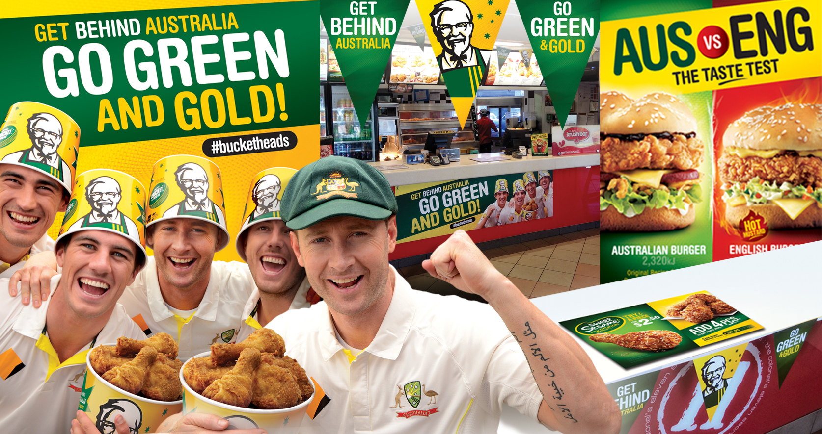 TASK: Design & copywrite a suite of POS materials supporting the cricket Australia campaign in-store. The centerpiece of which was a dramatic transformation of key restaurants from England’s red and white colours to Australia’s green & gold.